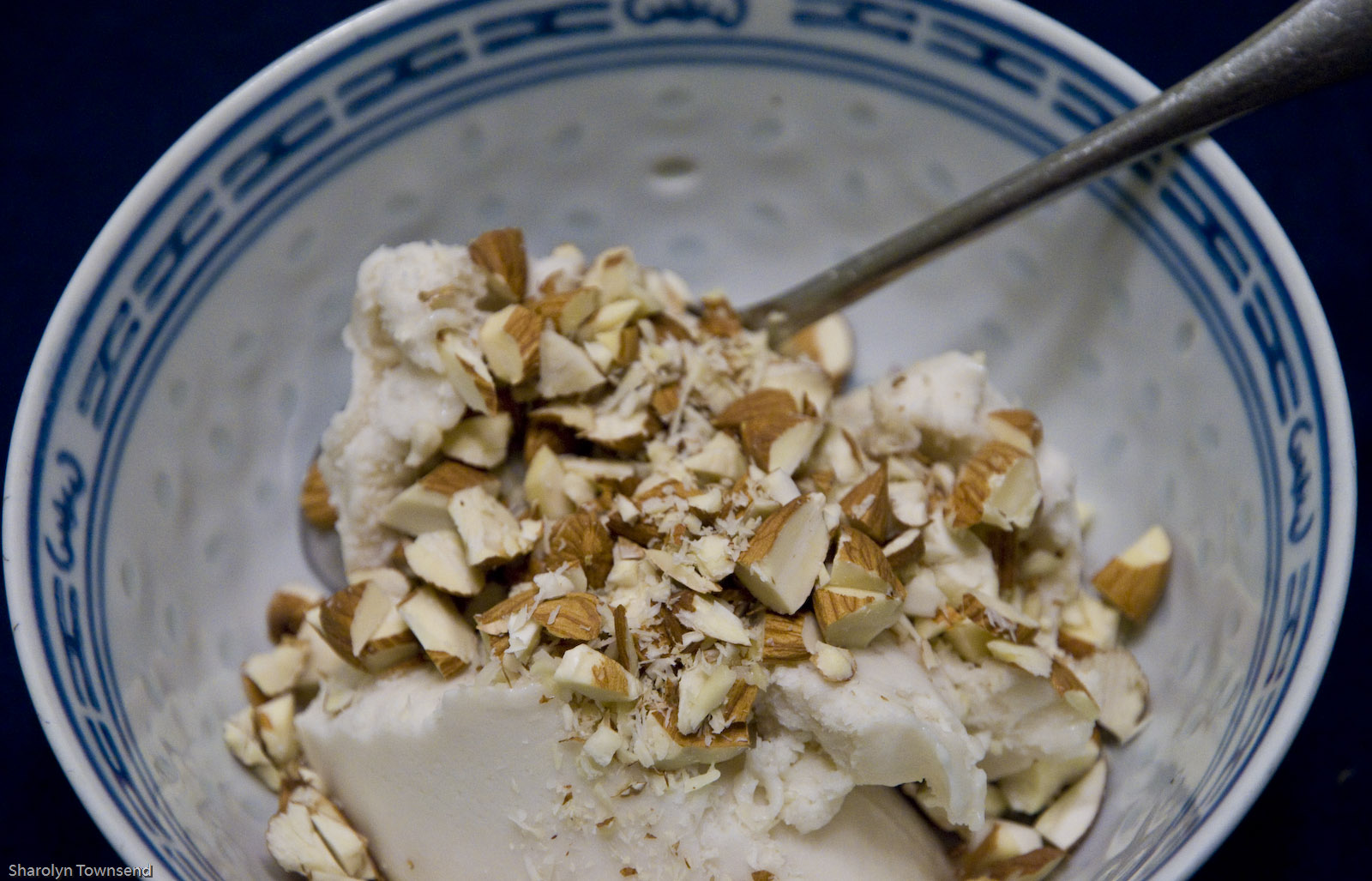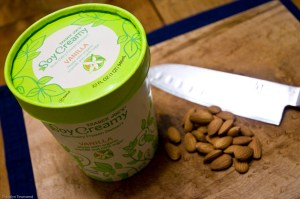 Plain, soy ice cream. (In California we have an awesome grocery chain called Trader Joe’s that carries this stuff. Unfortunately for my Canadian friends you will have to find it elsewhere. I choose soy based rather than rice based because of its nutty flavour.)
