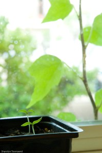 And my hubby planted a lot of seeds that have been happily germinating on the window sills in our apartment. Look at this happy sprout greeting the vegetation outside our window: