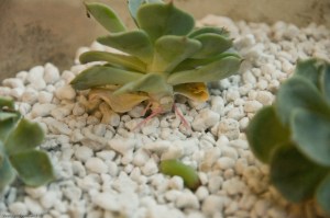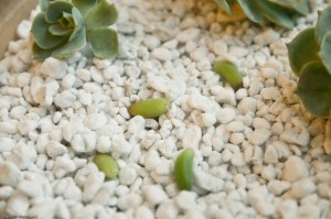 So last time I wrote about succulents I’d just been to the garden center and picked up a few new wonders of the succulent variety as well as a handful of loose succulent leaves. Well, I laid them out on a bed of perlite and left it outside under filtered light (my covered porch) and waited. It’s been what…two weeks now? Well, I am happy to report that they are now pushing out roots. Check them out!
