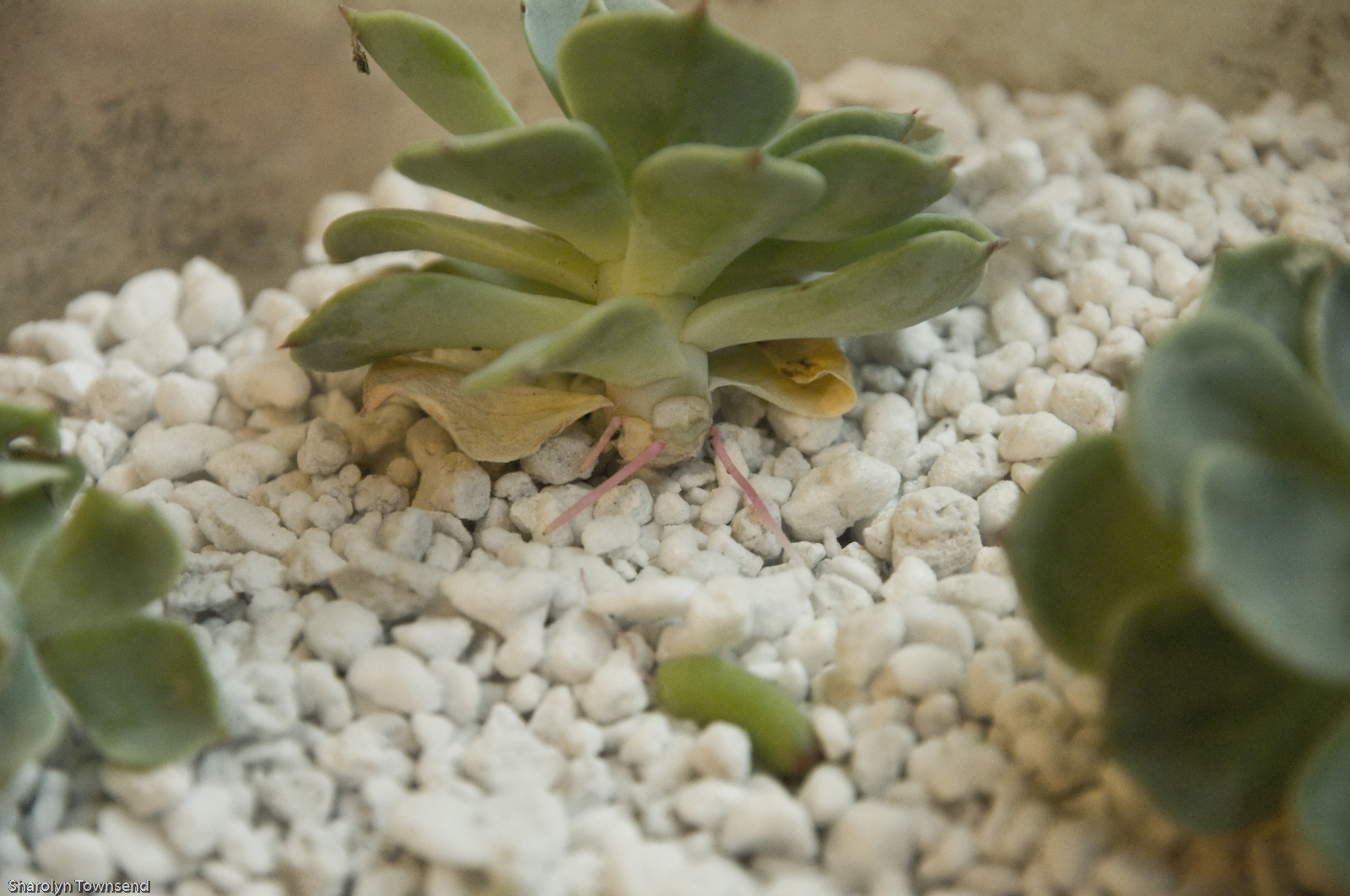 I also showed you how you can propagate by just cutting off succulent heads, scabbing them over and putting them directly in soil. Well, I cut too many heads and didn’t have enough planters, so some of the heads I left sitting on the perlite. Well, wouldn’t you know it, they also started to push out roots. These should be placed in soil pronto as the leaves are getting really thin, indicating that it’s using all it’s juice to make those roots and needs water soon.