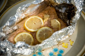 Once the grill was ready, the salmon went on. Couldn’t tell you exactly how long since we usually determine its done-ness by poking at it. Roughly 10 minutes.