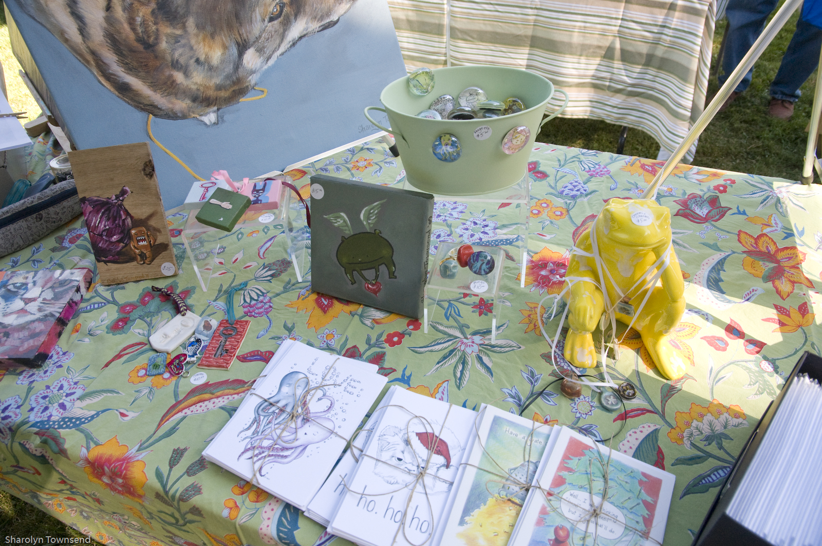 A little cluttered. And it was hard to get people to walk in and actually look at the paintings. A little more thought needs to go into the whole thing. Definitely a less patterned table-cloth is in order.