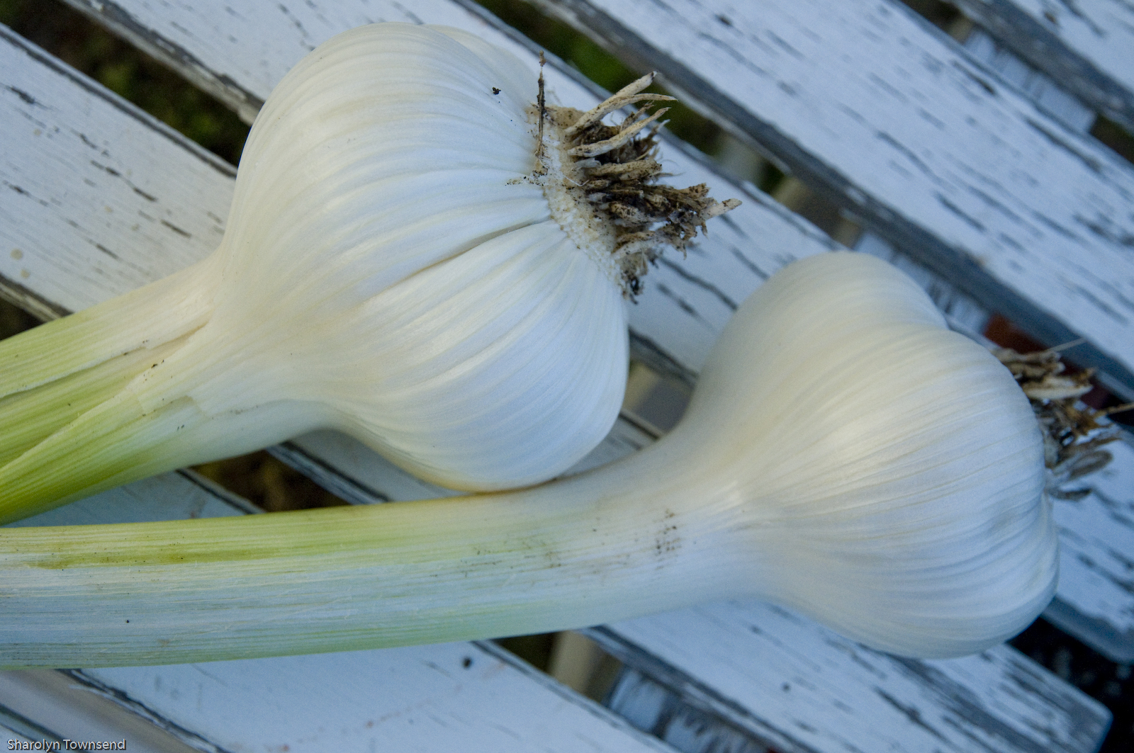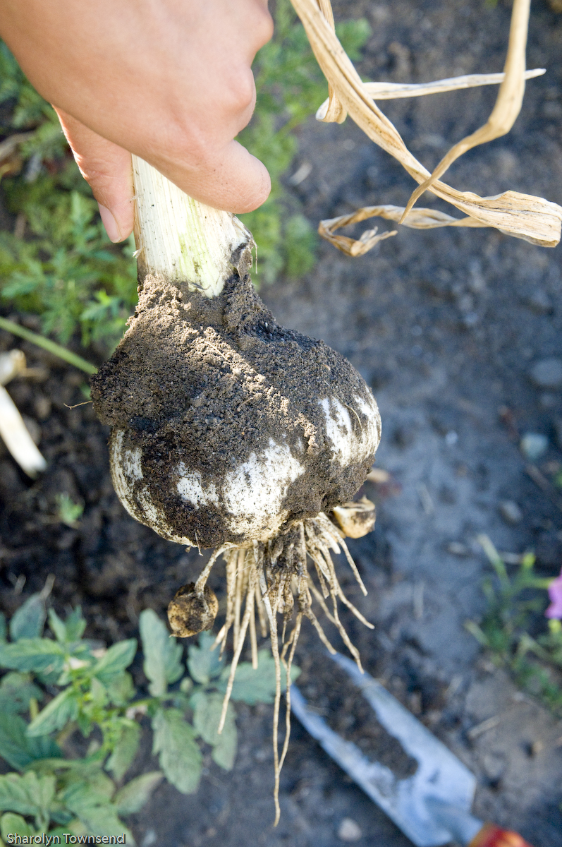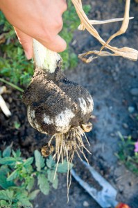 The elephant garlic that started to magically grow this year, having skipped the previous year when it was actually planted, had started to grow flowers on top. We caved and googled ” when to harvest elephant garlic” and learned that we were really late. For some reason we thought we had to wait until the stalk shriveled and dried. Not so, you’re supposed to wait until the bottom leaves brown but the rest is still green. Then stop watering for a few days to allow it to begin to dry and then pull it from the ground. So we scampered out to the garden ( as if a few extra seconds would make us any less late in harvesting the things) and we gingerly pulled them out and found: