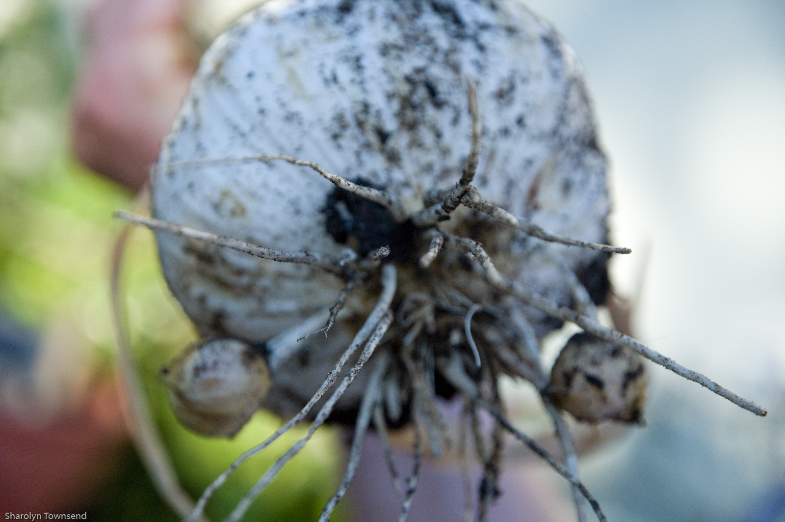 Note the little garlics hanging off the roots. No idea what that is exactly- must be its way of propagating itself. I imagine if left in the soil we’d have a whole planter box full of elephant garlic come next spring.