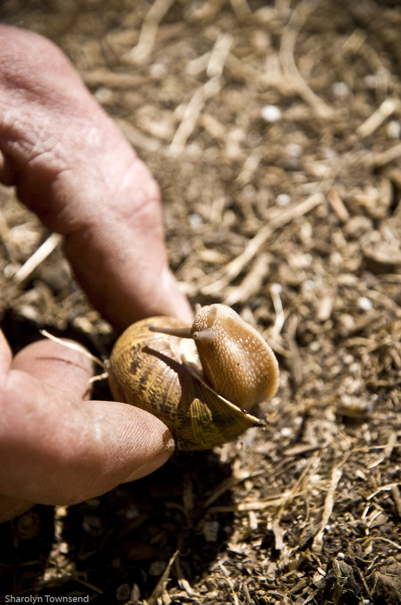 I won’t show you shots of the massacre lest it unsettle you. But here’s a lovely escargot, another garden terror. Our method of snail removal is to toss them over our fence into the back field. This guy is blissfully unaware of his upcoming aerial flight.